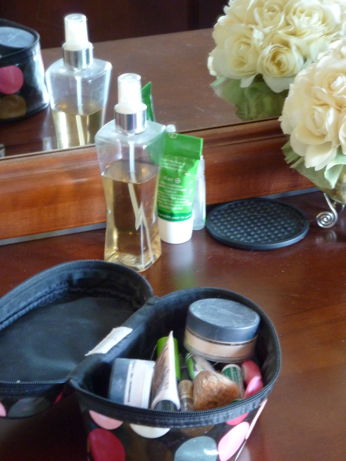 Anyway, I don't spend a lot of money on beauty products, but one of the things I splurge on (with a 20% off coupon, of course) is mineral makeup. I am very fair-skinned and have found it to be nice and light with a more believable skin tone match than traditional foundations. The problem with this nice powder makeup is that it gets everywhere, creating a pale orange dust.
